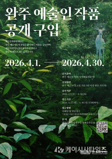 (케이시사타임즈) (재)완주문화관광재단(이사장 유희태)은 지역 미술 시장 활성화와 예술인의 안정적인 창작 환경 조성을 위해 ‘2026 완주 예술인 작품 공개 구입’사업을 실시한다.