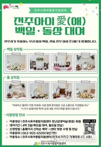 지원 대상은 전주지역 출생아 중 백일(생후 2~4개월) 또는 돌(생후 11~13개월)을 맞이한 영아 가정으로, 상차림 테이블과 전통 소품, 아동 의상 등으로 구성된 백일상·돌상 세트가 4박 5일간 무료로 대여된다. 단, 아동 의상 대여 시에는 세탁비 1만 원이 별도로 부과된다.
