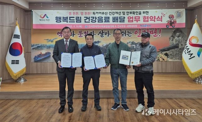 (케이시사타임즈) 인지면지역사회보장협의체(공공위원장 박한일, 민간위원장 유병상)는 9일 지역특화사업인 '행복드림 건강음료 배달'사업 추진을 위해 건국우유 서해대리점(대표 김성태)과 업무협약을 실시했다.