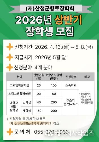 (케이시사타임즈) (재)산청군향토장학회는 오는 13일부터 5월 8일까지 ‘2026년도 상반기 장학금’을 신청받는다고 10일 밝혔다.