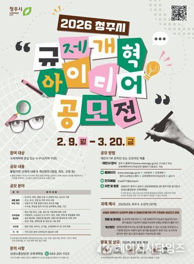(케이시사타임즈) 청주시는 시민이 체감할 수 있는 다양하고 창의적인 규제개혁 아이디어를 발굴해 일상생활과 경제활동을 제약하는 규제를 적극 개선하고자 ‘2026 청주시 규제개혁 아이디어 공모전’을 개최한다고 8일 밝혔다.