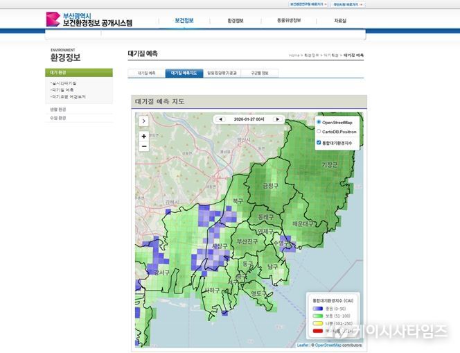 (케이시사타임즈) 부산시 보건환경연구원은 시민 생활권의 대기질 상태를 쉽고 직관적으로 이해할 수 있도록 '지역별 상세 대기질 예측지도 서비스'를 운영한다고 밝혔다.