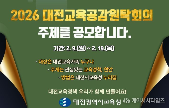 (케이시사타임즈) 대전시교육청은 교육정책에 대한 교육공동체의 다양한 의견을 수렴하고 소통 중심의 교육행정을 실현하기 위해, 2월 9일부터 19일까지 11일간‘2026년 대전교육공감원탁회의' 토론 주제를 공모한다고 밝혔다.