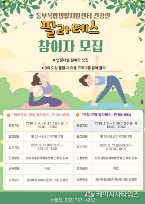 (케이시사타임즈) 원주시 동부복합생활지원센터 건강관은 오는 19일부터 중·장년을 대상으로 한 필라테스 프로그램 참여자를 모집한다.