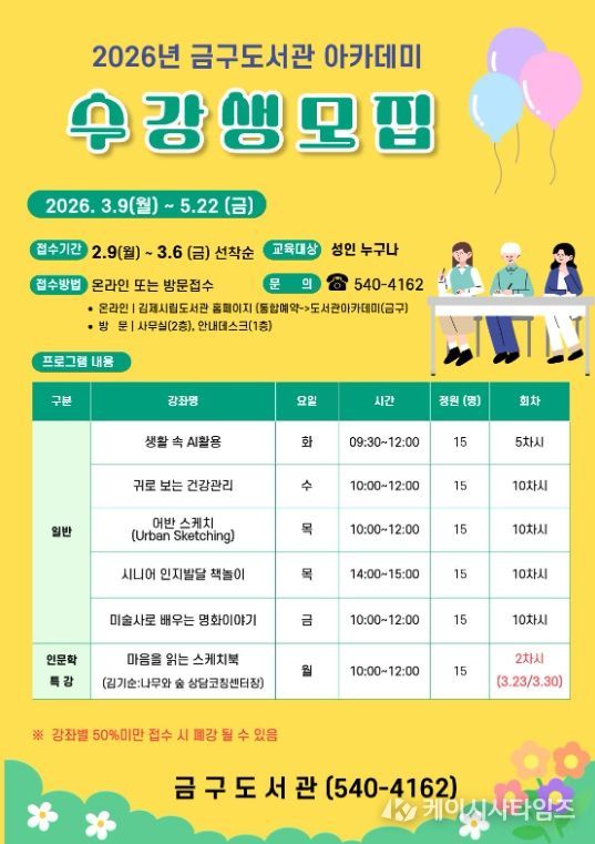 (케이시사타임즈) 김제시 금구도서관은 지역 주민들의 자기 계발과 문화 향유 기회를 확대하기 위해 2026년 금구도서관 아카데미 수강생을 오는 3월 6일까지 선착순 모집한다고 밝혔다.