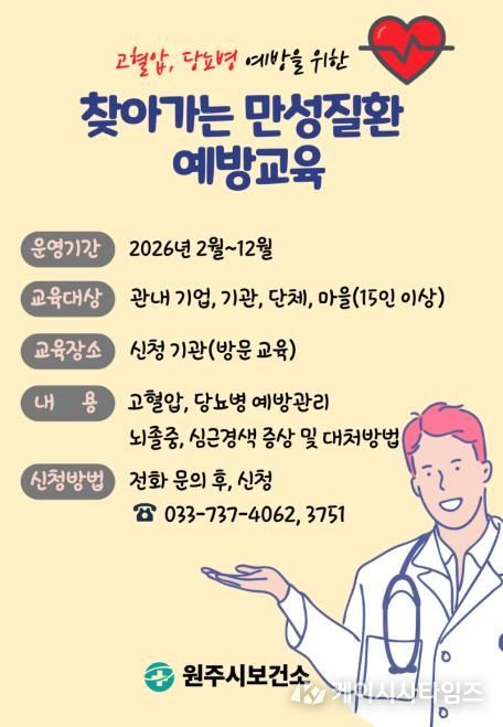 (케이시사타임즈) 원주시보건소는 2월부터 12월까지 지역 주민을 대상으로 고혈압·당뇨병 등 만성질환 예방교육을 운영한다.