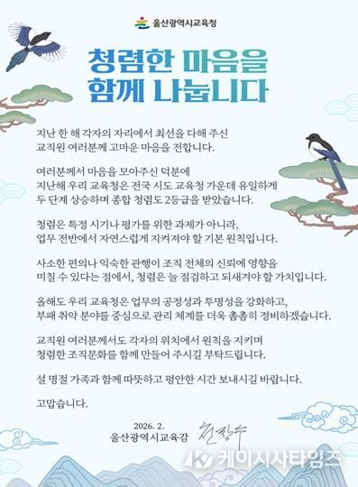 (케이시사타임즈) 울산광역시교육청은 설 명절을 앞둔 12일 울산 지역 전 교육기관과 학교 교직원에게 청렴 의지를 다지는 ‘청렴 서한문’을 보냈다.
