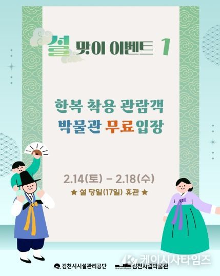 (케이시사타임즈) 김천시시설관리공단(이사장 김재광)은 2026년 설 명절을 맞아 감문국이야기나라와 김천시립박물관을 중심으로 가족 단위 관람객이 함께 즐길 수 있는 ‘설맞이 문화 행사’를 운영한다. 이번 행사는 2월 14일부터 2월 18일까지 진행된다.
