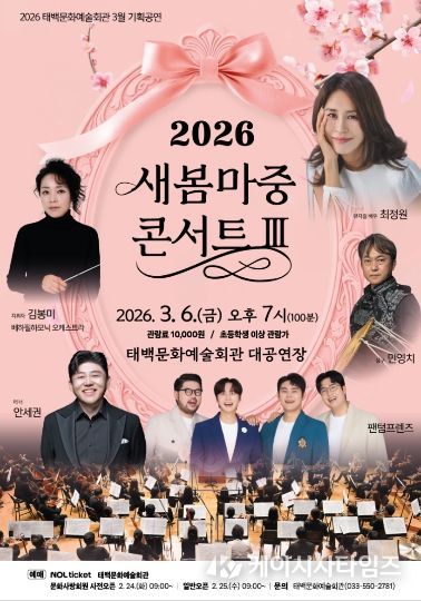(케이시사타임즈) 태백시는 태백문화예술회관은 3에서 기획공연으로 『새봄마중 콘서트 Ⅲ』를 오는 3월 6일(금) 오후 7시 태백문화예술회관 대공연장에서 개최한다고 밝혔다.