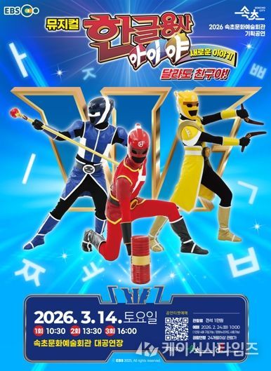 (케이시사타임즈) 속초시는 3월 14일 10시 30분, 13시 30분, 16시 하루 3회 속초문화예술회관에서 뮤지컬‘한글용사 아이야 새로운 이야기-달라도 친구야’를 선보인다.