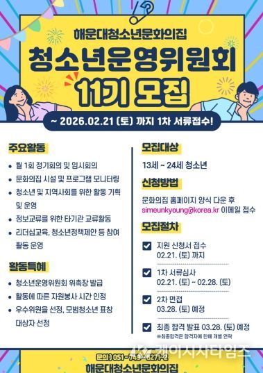 (케이시사타임즈) 해운대청소년문화의집이 지역 청소년의 참여 확대를 위해 ‘청소년운영위원회 11기 청바라기’를 공개 모집한다. 모집 대상은 해운대구에 거주하거나 관내 학교에 재학 중인 13세부터 24세 이하 청소년이며, 접수는 이달 21일까지 진행된다.