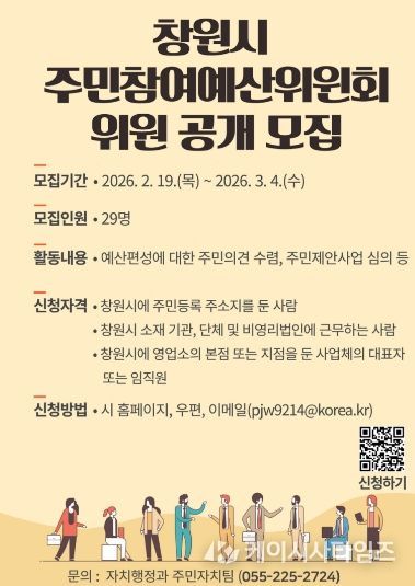 (케이시사타임즈) 창원특례시는 올해 3월 말로 만료되는 주민참여예산위원 임기를 맞아 원활한 위원회 운영을 위해 2월 19일부터 3월 4일까지 신규 위원 29명을 모집한다.