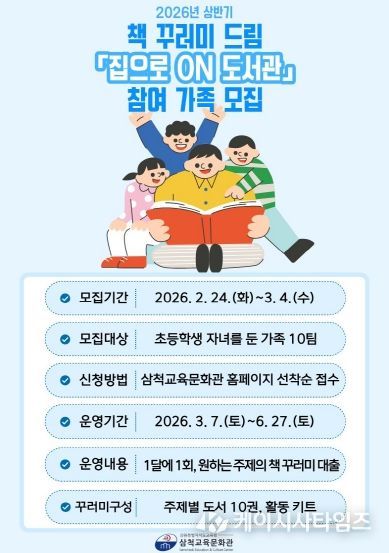 (케이시사타임즈) 삼척교육문화관은 3월부터 6월까지 가족 단위 독서 문화를 장려하기 위하여 초등학생 자녀를 둔 가족을 대상으로 책 꾸러미 드림 ‘집으로 온(ON) 도서관’을 운영한다.