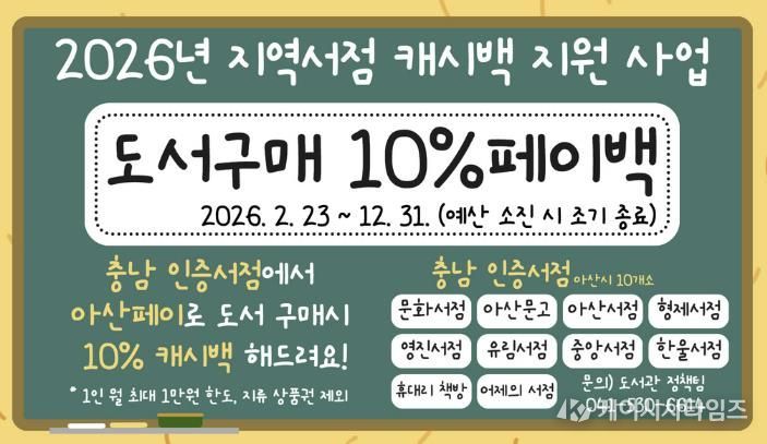 (케이시사타임즈) 아산시는 지역 서점 활성화와 시민 독서환경 조성을 위해 오는 23일부터 “2026년 충남 인증 서점 도서 구매 캐시백 지원” 사업을 본격 시행한다.