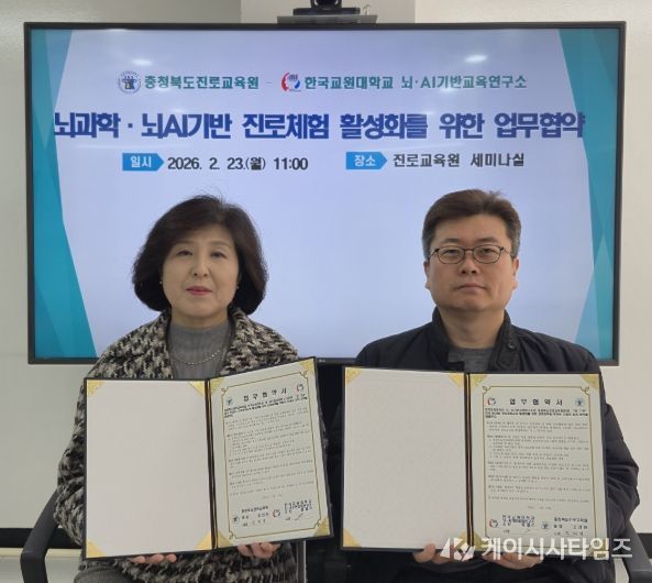 (케이시사타임즈) 충청북도교육청 직속기관 진로교육원은 23일, 진로교육원에서 한국교원대학교 뇌·AI기반교육연구소와 뇌과학·뇌AI 기반 맞춤형 진로설계 역량 함양을 위한 업무협약을 체결했다고 밝혔다.