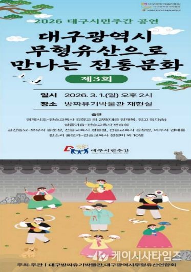 (케이시사타임즈) 대구문화예술진흥원 박물관운영본부 소속 대구방짜유기박물관에서는 2026년 대구시민주간(2.21.~28.)을 맞아 3월 1일 오후 2시, 박물관 재현실에서 대구의 전통문화를 알리는 특별 공연 ‘대구광역시 무형유산으로 만나는 전통문화’를 개최한다.