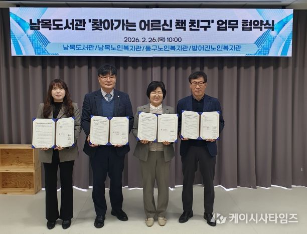 (케이시사타임즈) 남목도서관은 2월 26일 오전 10시 3층 다목적실에서 동구 지역 내 노인복지관 3개 기관과 함께 ‘찾아가는 어르신 책 친구’ 사업 추진을 위한 업무협약을 체결했다.
