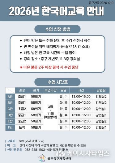 (케이시사타임즈) 울산중구가족센터(센터장 서선자)가 2026년 결혼이민자 역량강화 지원사업의 일환으로 ‘한국어 교육 과정’을 운영한다.