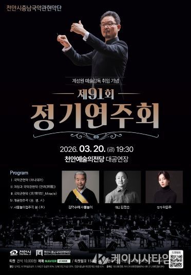 시 관계자는 “계성원 예술감독 취임 후 첫 정기연주회인 만큼 국악관현악의 새로운 지평을 여는 의미 있는 시간이 될 것”이라며 “천안시는 앞으로도 시민들이 일상에서 고품격 전통예술을 향유할 수 있도록 다양한 기획 공연을 이어가겠다”고 말했다.