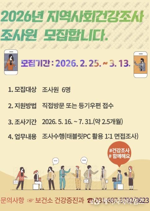 (케이시사타임즈) 여주시보건소 건강증진과는 질병관리청, 한양대학교와 함께 공동으로 실시하는 지역사회건강조사를 수행할 조사원을 2월 25일부터 3월 13일까지 모집한다고 밝혔다.