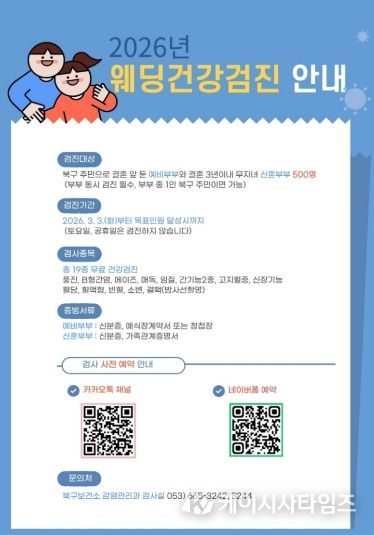(케이시사타임즈) 대구 북구보건소(소장 이영숙)는 오는 3월 3일부터 예비(신혼)부부의 건강한 출발을 지원하기 위해 '2026년 웨딩건강검진사업'을 시행한다.