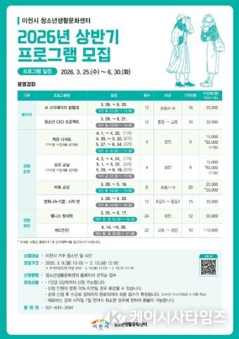 (케이시사타임즈) 이천시 청소년생활문화센터가 청소년과 지역주민의 건강한 생활문화 형성과 역량 강화를 위해 ‘2026년 상반기 프로그램’을 운영하고 수강생을 모집한다고 밝혔다.