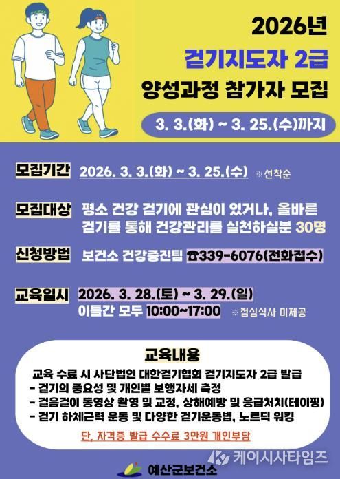 (케이시사타임즈) 예산군보건소는 주민의 건강한 생활습관 정착과 걷기 활성화를 위해 걷기지도자 2급 양성과정 교육 참가자 30명을 선착순 모집한다.