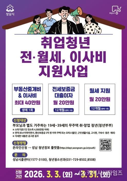 (케이시사타임즈) 성남시는 사회초년생의 주거 안정을 돕기 위해 ‘취업 청년 전월세·이사비 지원사업’ 대상 인원을 기존 750명에서 1050명으로 늘렸다고 3일 밝혔다.