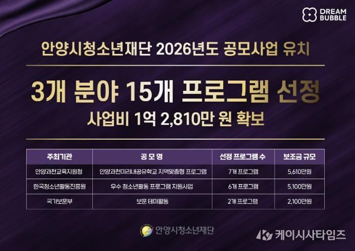 (케이시사타임즈) 안양시청소년재단은 2026년 국가 및 공공기관, 교육청 등이 추진하는 주요 공모사업 3개 분야에서 15개 프로그램이 선정되어 총 1억 2,810만 원 규모의 사업비를 확보했다고 3일 밝혔다.