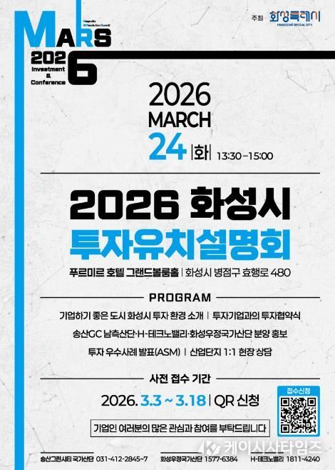 (케이시사타임즈) 화성특례시가 오는 3월 24일 푸르미르 호텔에서 ‘2026 화성특례시 투자유치 설명회’를 개최하고, 3월 3일부터 3월 18일까지 QR코드를 통한 사전접수를 진행한다.