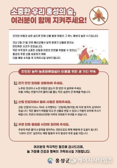 (케이시사타임즈) 홍성군은 산림 인접 지역 농막과 농촌체류형쉼터 이용 증가에 따라 화재 위험을 사전에 차단하기 위해 관련 소유자를 대상으로 산불예방 안내문을 배포하고, 군민 참여형 안전문화 확산에 나섰다. 이번 조치는 생활 속 실천 중심의 예방 활동을 통해 산불 위험을 낮추기 위한 선제적 대응이다.
