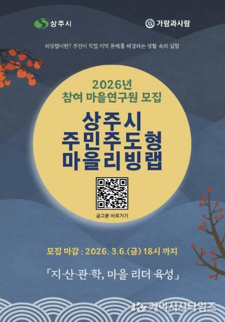 (케이시사타임즈) 상주시는 지방소멸 위기에 대응하고 주민이 주도하는 살기 좋은 마을 조성을 위해 녪년 상주시 주민주도형 마을리빙랩’참여자를 오는 3월 6일까지 모집한다.