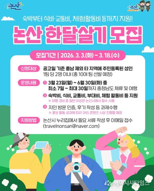 (케이시사타임즈) 논산시가 충남 관광의 해를 맞아 ‘2026년 논산 한달살기 관광’참가팀을 모집한다.