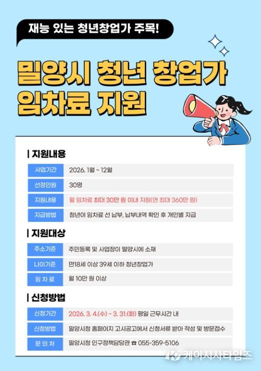 (케이시사타임즈) 경남 밀양시는 고물가와 경기 침체로 어려움을 겪는 청년 창업가들의 초기 경영 부담을 덜어주고 지역 내 안정적인 정착을 돕기 위해 ‘2026년 청년창업가 임차료 지원사업’ 대상자를 모집한다.