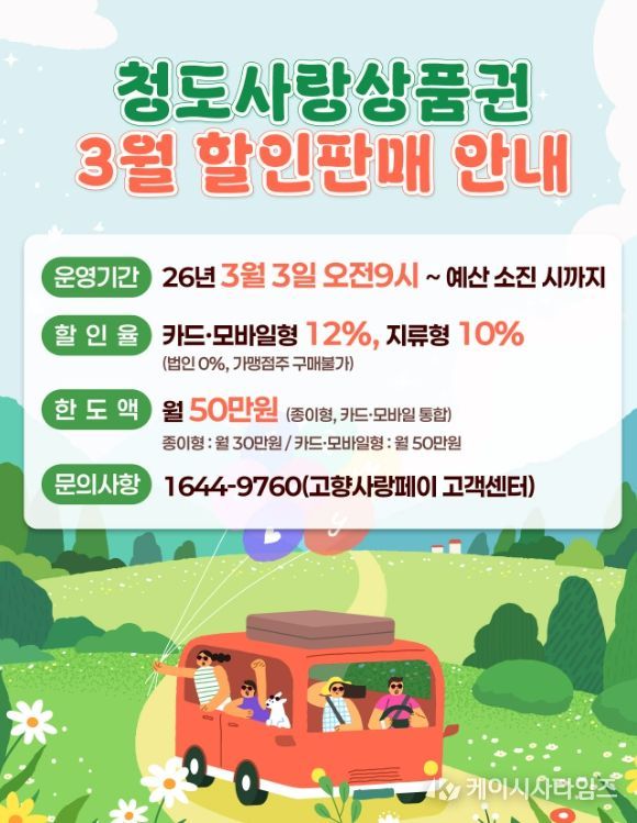 (케이시사타임즈) 청도군은 지역경제 활성화와 소상공인 지원 강화를 위해 올해 3월부터 카드형 청도사랑상품권 할인율을 기존 10%에서 12%로 인상한다고 밝혔다.