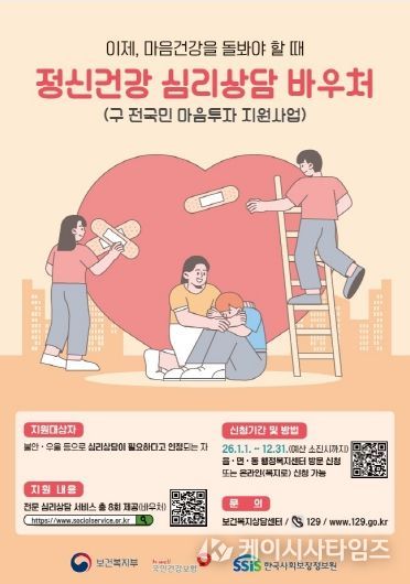 (케이시사타임즈) 포항시는 우울과 불안 등 정서적 어려움을 겪는 시민들을 위해 지난해에 이어 올해도 전문 심리상담 서비스를 지원하는 ‘정신건강 심리상담 바우처 사업’을 추진한다고 밝혔다.
