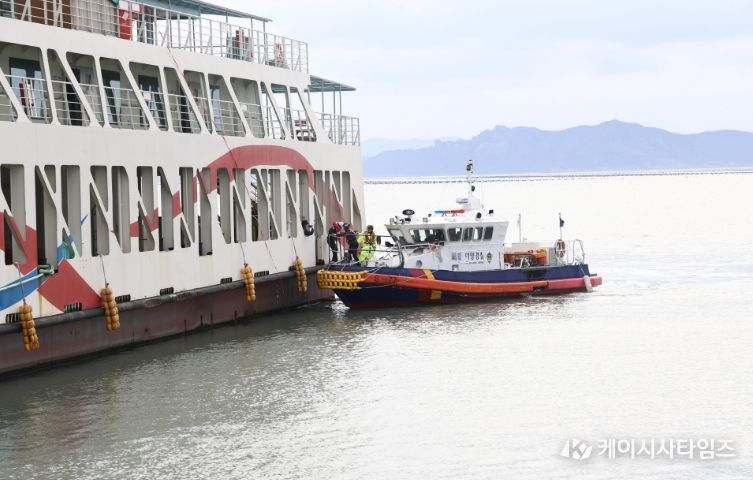 (케이시사타임즈) 완도해양경찰서(서장 김태환) 지난 5일 전남 완도군 화흥포항 인근 해상에서 관계기관과 함께 여객선 내 전기차 화재 사고에 대비한 합동 훈련을 실시했다.