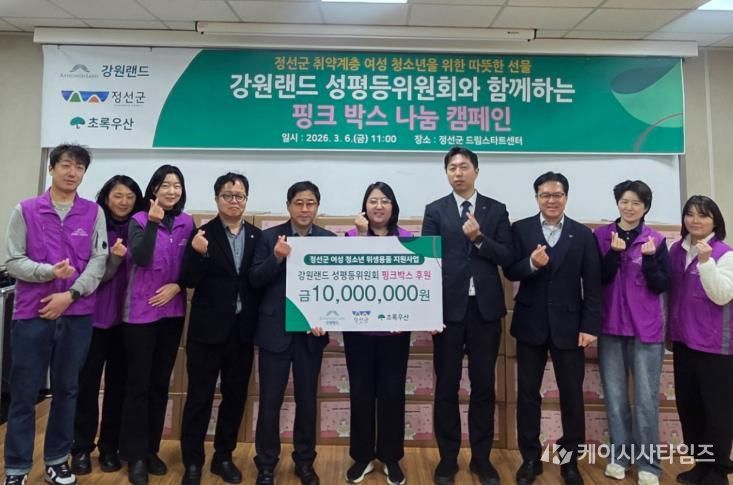 (케이시사타임즈) 정선군은 3월 6일 정선군 여성회관 소회의실에서 강원랜드 성평등위원회와 초록우산 어린이재단 강원지역본부가 후원하는 ‘핑크박스’ 전달식을 개최했다.