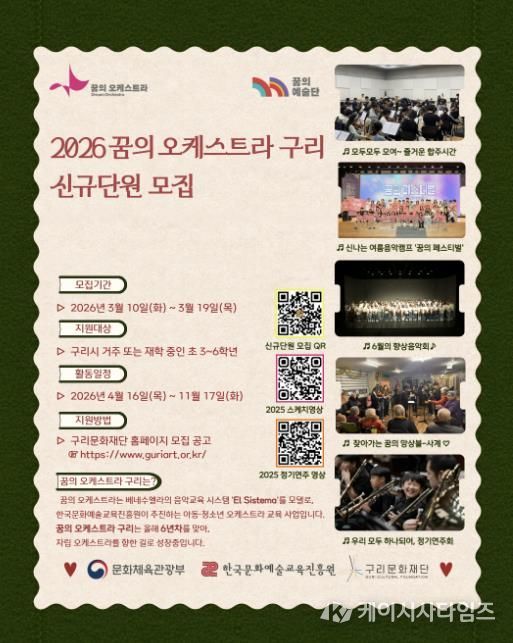 (케이시사타임즈) (재)구리문화재단이 2026년 ‘꿈의 오케스트라 구리’에 함께할 신규 단원과 교육 강사를 공개 모집한다. 이번 모집을 통해 초등학교 3학년부터 6학년까지의 아동 약 10명과 분야별 교육 강사 13명을 선발할 예정이다.