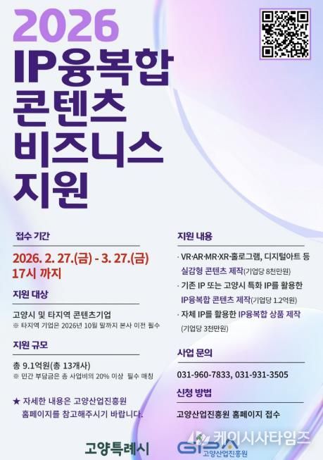 (케이시사타임즈) 고양특례시와 고양산업진흥원이 오는 3월 27일까지 ‘IP융복합 콘텐츠 비즈니스 지원사업’에 참여할 기업을 모집한다.