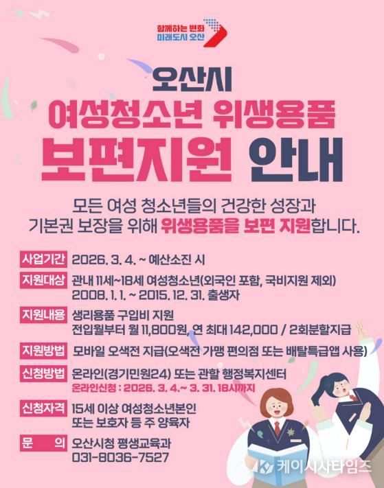 (케이시사타임즈) 오산시는 관내 11세부터 18세까지의 여성청소년을 대상으로 '여성청소년 위생용품 보편지원 사업'을 추진한다고 밝혔다.