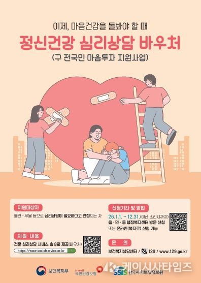(케이시사타임즈) 울산동구보건소는 우울, 불안 등 정서적 어려움을 겪고 있는 주민들을 대상으로 심리상담 서비스를 이용할 수 있는 ‘정신건강 심리상담 바우처사업(옛 전국민 마음투자 지원사업)’을 지속 추진한다.