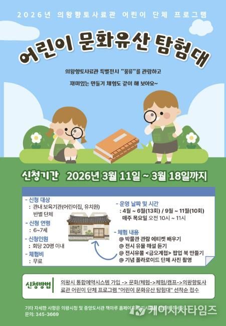 (케이시사타임즈) 의왕시 향토사료관이 오는 4월부터 6월, 9월부터 10월 매주 목요일에 어린이 단체 체험프로그램 ‘어린이 문화유산 탐험대’를 운영한다.