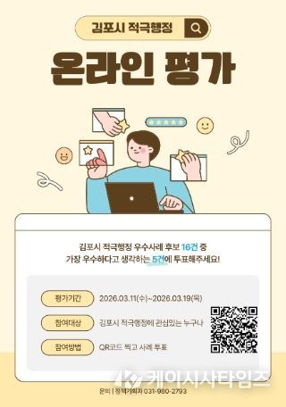 김포시 관계자는 “시민이 직접 우수사례를 선택하는 과정이 공직사회에 긍정적인 자극이 되어 공무원의 적극행정 실천 의지가 높아질 것으로 기대한다”고 밝혔다.