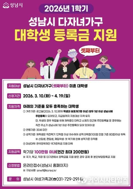 (케이시사타임즈) 성남시는 다자녀가구의 경제적 부담을 덜기 위해 셋째 이상 대학생에게 학기당 최대 100만원(연 200만원)의 등록금을 지원한다고 12일 밝혔다.