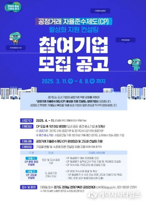 (케이시사타임즈) 경기도가 기업의 공정거래 자율준수 문화 확산과 경영 애로 해소 지원을 위해 ‘공정거래 자율준수제도(CP, Compliance Program) 활성화 지원 컨설팅’을 추진한다.