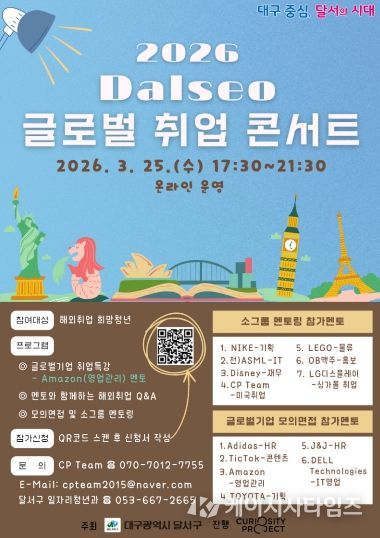 (케이시사타임즈) 대구 달서구는 해외취업을 희망하는 청년들의 글로벌 역량을 강화하고 해외 진출 기회를 확대하기 위해 3월 25일‘2026년 Dalseo 글로벌 취업콘서트’를 온라인으로 개최한다.