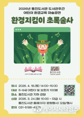 ‘환경지킴이 초록술사’ 공연은 4월 18일 오후 2시부터 3시까지 통진도서관 지하 강당에서 진행된다. 대상은 5~9세 어린이 및 보호자 100명이다. 참여를 원할 경우 3월 24일 오전 10시부터 통진도서관 누리집에서 신청하면 된다.