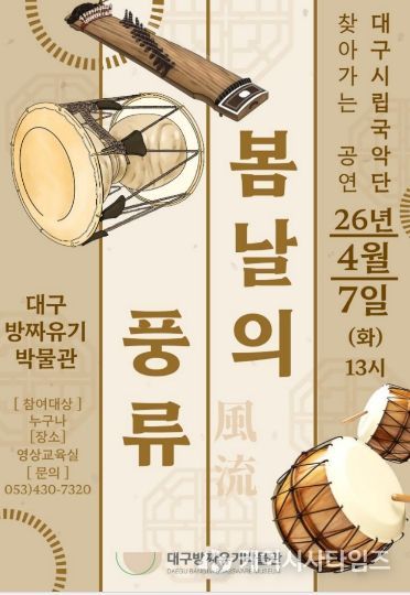 (케이시사타임즈) 대구문화예술진흥원 박물관운영본부 소속 대구방짜유기박물관은 봄날에 팔공산 역사문화 특강과 국악 공연을 기획해 3월 24일 오후 2시에 ‘탁본자료로 만나는 팔공산 역사문화 깊이’를, 4월 7일 오후 1시에 대구시립국악단 찾아가는 공연 ‘봄날의 풍류’를 개최한다.