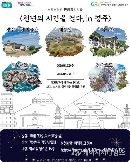 (케이시사타임즈) (재)군포시청소년재단(대표이사 김덕희) 군포시학교밖청소년지원센터(센터장 강연미)는 학교 밖 청소년 16명을 대상으로 오는 4월 22일부터 24일까지 2박 3일간 경상북도 경주시 일대에서 ‘역사캠프 현장체험학습 프로그램’을 운영한다고 밝혔다. 참가신청은 구글폼 등을 통해 접수 받은 뒤 신청 내용을 바탕으로 참여 대상자를 선정할 예정이다.